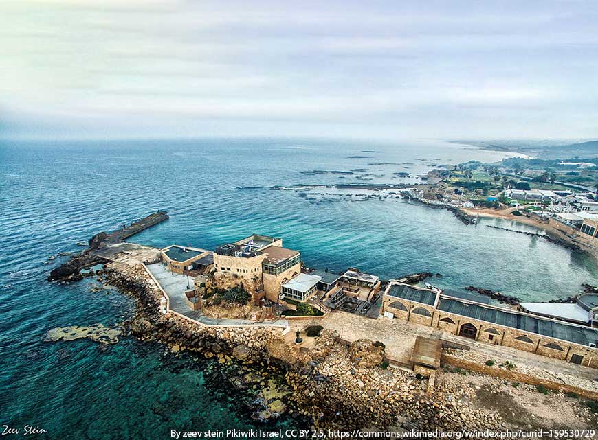 Кесария Маритима (Кесария Палестинская), расположенная примерно в 45 км к северу от современного Тель-Авива. Еврейский историк Иосиф Флавий писал, что Ирод построил огромный искусственный порт, предназначенный для судов, направляющихся в Египет, с подводными волнорезами, внушительными императорскими статуями и выдающимся в море маяком.