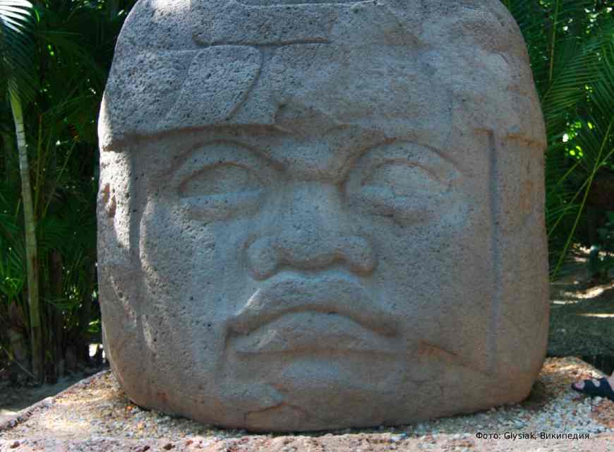 Ещё более загадочное явление — ольмекские головы. Представьте себе, перед вами огромное изображение человеческого лица, обрамленного шлемом с перемычкой у подбородка. Изображены огромные уши, из которых торчат ритуальные украшения. Самое удивительное в этих головах — это то, что на лицах явно просматриваются негроидные черты; ученые считают, что это были политики и важные общественные фигуры.